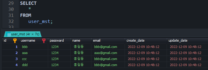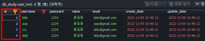 >> 왼쪽 id가 1 일 때 user_dtl에서 값을 모두 가지고 온다. (id가 2,3,4일 때도 동일)