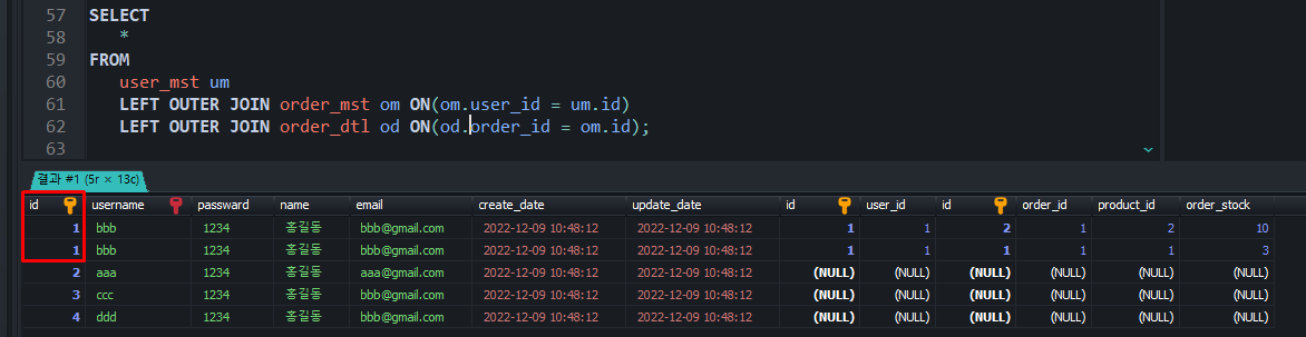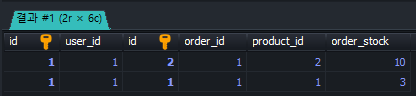 아래의 JOIN문 실행 시 id값에 1이 두 번 나오는 이유는 product 때문에 order의 1에 대한 정보가 2개 이기 때문이다.