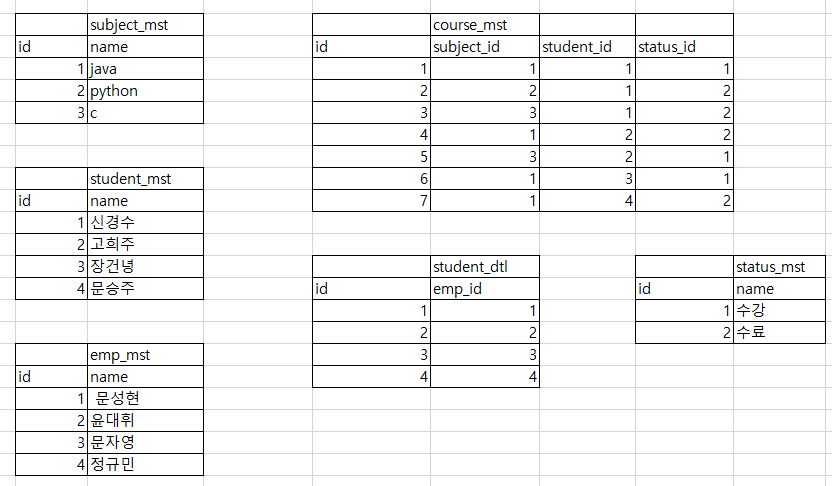 course_mst / student_mst / emp_mst / status_mst (지정된 테이블 4개 포함)