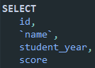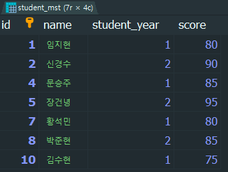 WHERE문의 조건으로 = 비교 연산자를 사용하여 'student_year'이 1인 데이터만을 조회한다.