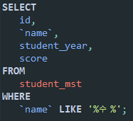 'student_mst'테이블에서 'name'에 '수'가 들어있는 데이터를 조회해라