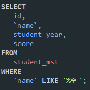 'student_mst'테이블에서 'name'의 맨 뒤가 '주'로 끝나는 데이터를 조회해라