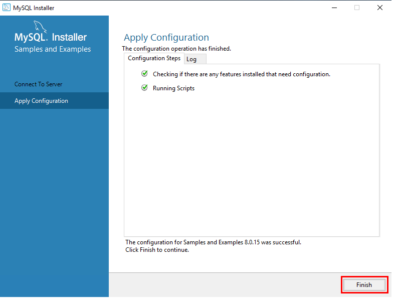 Check를 클릭한 후 Next를 클릭하여 MySQL 서버에 연결합니다.