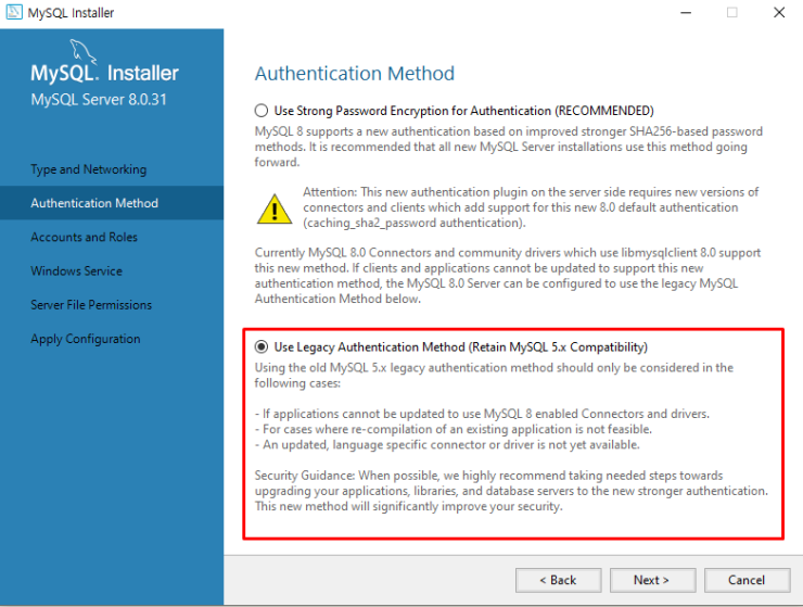 Use Legacy Authentication method(retain mysql 5.x compatibility) 5.x 버전 호환성 유지가 필요한 경우